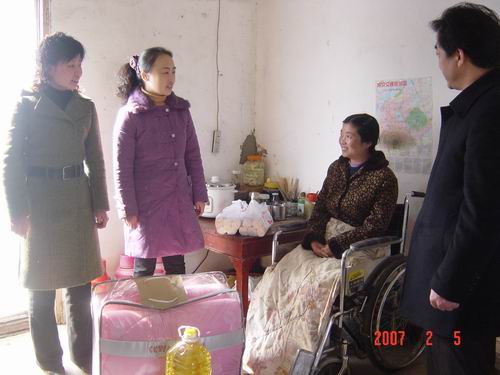 为了搞好春节“低保”特困户“送温暖”工作,大圹圩农场工会积极协助天长市民政局有关部门提前做好“低保”特困户的摸底调查工作,农场27户“低保户”有10户被确定为“低保”“送温暖”对象,得到了党和政府实实在在的帮助。对这些特困“低保户”,春节前,农场还将“送温暖”,给予他们一定的资金救助,尽最大努力帮助这些社会弱示群体克服困难,过好春节。图为:滁州市民政局领导及天长民政同志在场慰问“低保”户的场景。