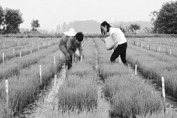 图为6月22日,大圹圩农场皖东农科水稻育种技术员在试验田里调查小秧苗叶龄、苗情、病虫害和水浆管理情况。(农民日报2015年6月29日 05 版,李炳旺 夏庆芳摄)
